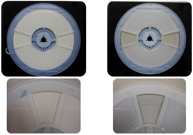 村田MURATA電容公司的紙帶襯紙是全新的載帶襯紙和混合再生紙載帶襯紙結(jié)合使用的。白色的襯紙為全新載帶襯紙,灰色的為混合再生紙載帶襯紙。兩者顏色有所不同,但規(guī)格及品質(zhì)卻并無差異。